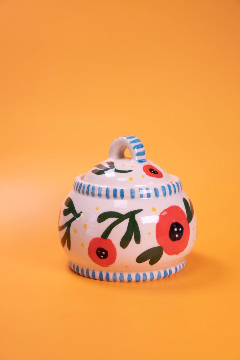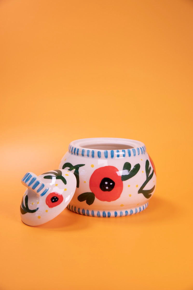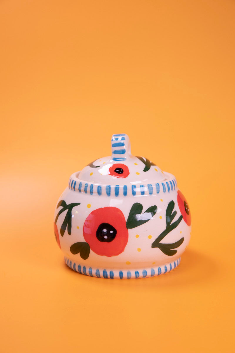 This 5" tall, 5" wide lidded jar is hand-painted with my favorite poppy design. This dishwasher-safe jar is perfect for everything from candy to q-tips, sugar to shortbread. Use this as storage in your kitchen, bathroom, or bedroom, or leave it out on your coffee table filled with Werther's originals for your many distinguished house guests.