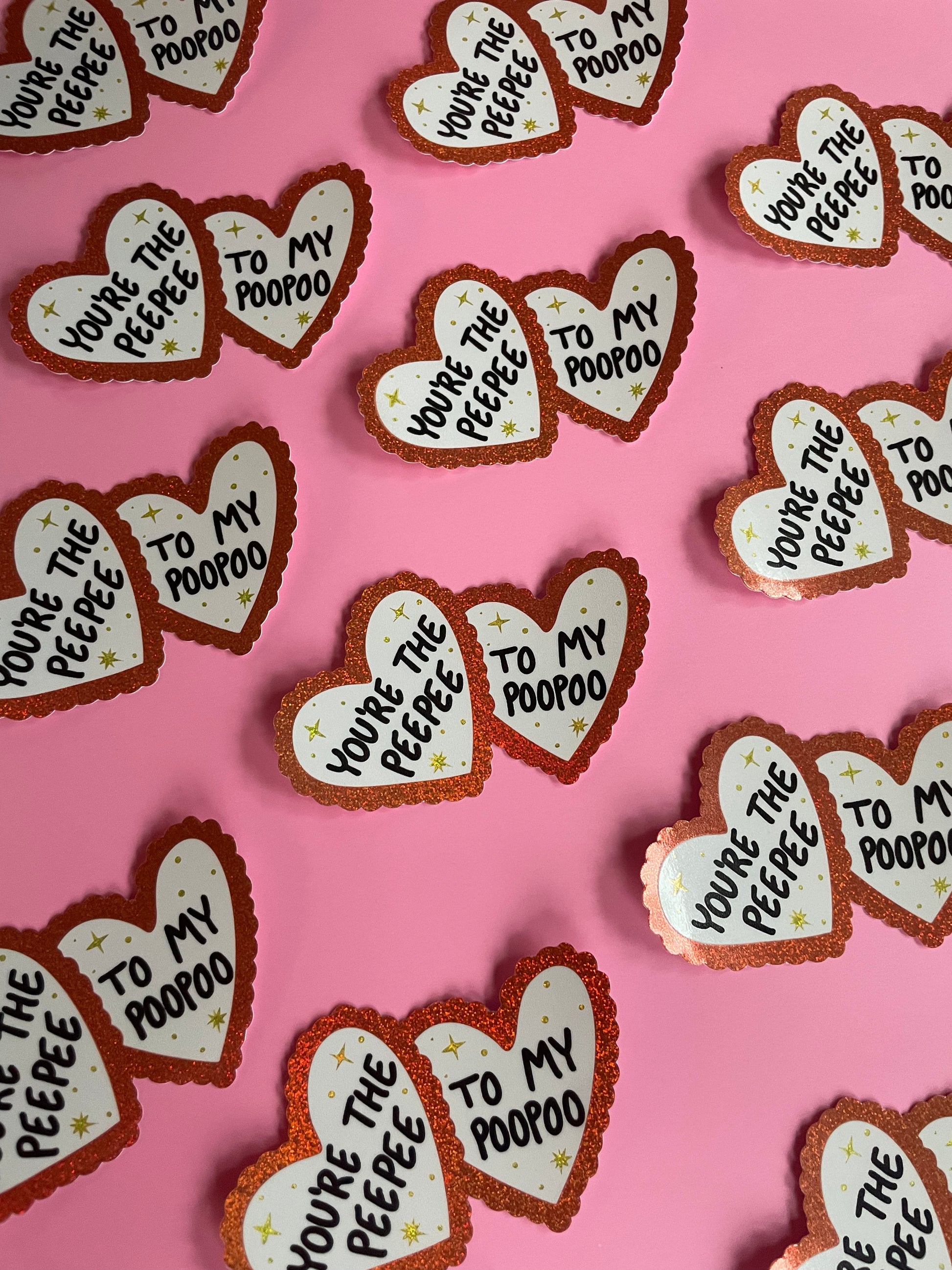 You? Are the pee pee. To? My poo poo. Give this incredibly romantic vinyl sparkly sticker to the peepee in your life. They are sure to be woo'd instantaneously by this incredible gesture of love. Platonic friend? That's fine, too. Let them be dazzled. You're sure to climb to the very top of their social calendar after the gift of this divine item. Roughly 3" across. Makes a great water bottle sticker, hydroflask sticker, bumper sticker, windshield sticker, you name it!